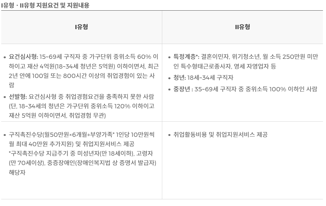 II유형은 '취업활동비용'과 '취업지원서비스'를 제공받습니다. I유형에 해당하지 않는 특정계층, 청년, 중장년 등이 지원대상입니다.