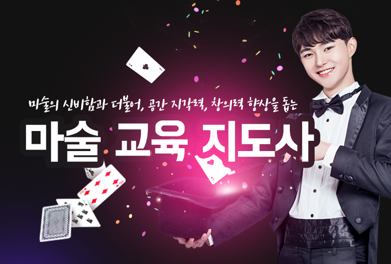 마술 교육지도사란 아이템을 이용하여, 일반인들이 일상에서 쉽게 접하기 어려운 신기한 마술을 직접 모여줌으로써, 보는 이들에겐 즐거움을 선사하고, 마술을 배워 활용하는 학습자에겐 창의력 계발과 공간지각력 및 언어구사력 향상, 발표력 및 집중력 향상을 돕는 다방면으로 매우 유익한 교육전문 지도사입니다.