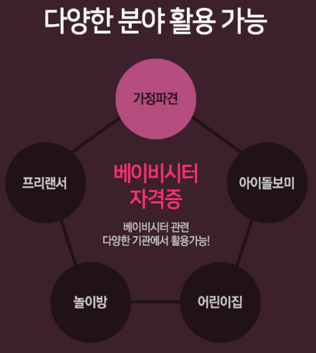 베이비시터자격증은 베이비서터 관련 다양한 기관에서 활용이 가능합니다. 예를 들어 프리랜서, 놀이방, 어린이집, 건강가정지원센터, 한부모가정지원센터, 다문화가족지원센터, 아동발달지원센터, 입양기관 등 아동보호기관, 아동복지시설, 심리상담센터, 아동상담센터, 영유아보육시설 등에서 활용이 가능합니다.