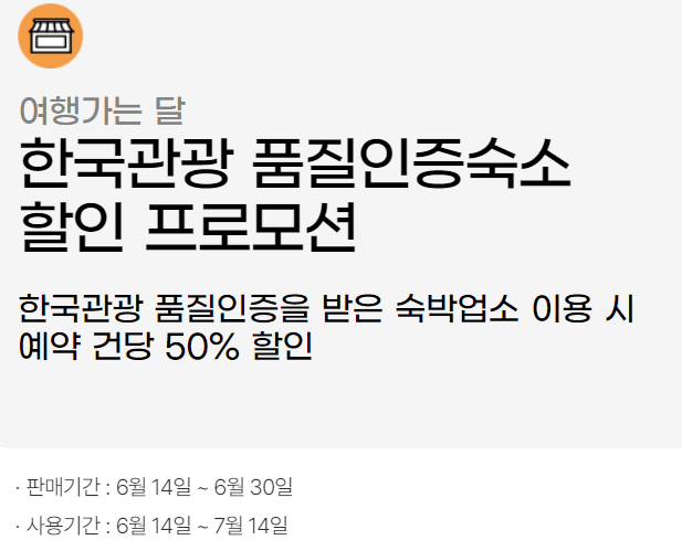구분 한국관광품질인증숙소 12개 광역시도 할인 전국 숙박 할인 판매기간 6월 14일 ~ 6월 30일 5월 30일 ~ 6월 1일 6월 2일 ~ 6월 30일 할인혜택 예약건당 50% 할인 숙박 5만원 할인 숙박 3만원 쿠폰제공 사용기간 6월 14일 ~ 7월 14일 5월 30일 ~ 7월 14일 6월 2일 ~ 7월 14일 문의처 6월초 1670-3980 1670-3980
