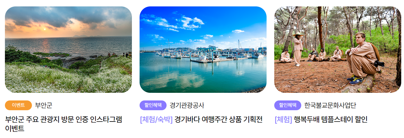 0123놀거리 혜택은 관광지 입장 할인, 방문인증에 따른 다양한 이벤트 행사 등 풍부한 혜택으로 만나 볼 수 있습니다.
