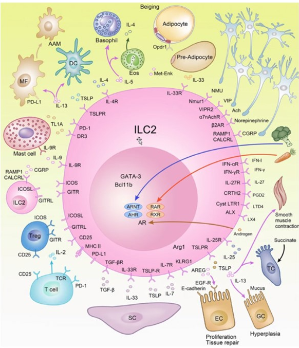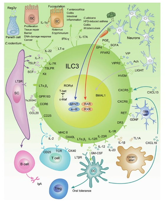 먼저 면역 세포 중에 조혈모세포(HSC:hematopoietic stem cell)에서 나온 ILC(innate lymphoid cell) 세포가 있습니다. 이 세포에는 세 가지 타입이 있는데 ILC 1, ILC 2, ILC 3 이 있는데 여기에는 다양한 수용체(아래그림 참조)들이 있습니다. 수용체는 생체외부의 물질을 세포막이나 세포질, 세포핵 속으로 단백질이나 또는 신경전달물질을 받아들이는 곳을 말합니다.
