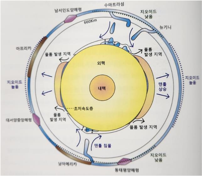 외핵에서 출발한 거대한 슈퍼플룸은 19억 년 전부터 시작되었으며 원생대에서 신생대까지 대륙의 이동에 결정적인 역할을 했습니다. 현재 지구과학이론은 대륙판과 해양판의 이동에 관한 판구조 이론과 외핵에서 상승하는 슈퍼플룸이론이 결합하여 지각 판들의 움직임을 지구 전체의 관점에서 설명하고 있습니다.